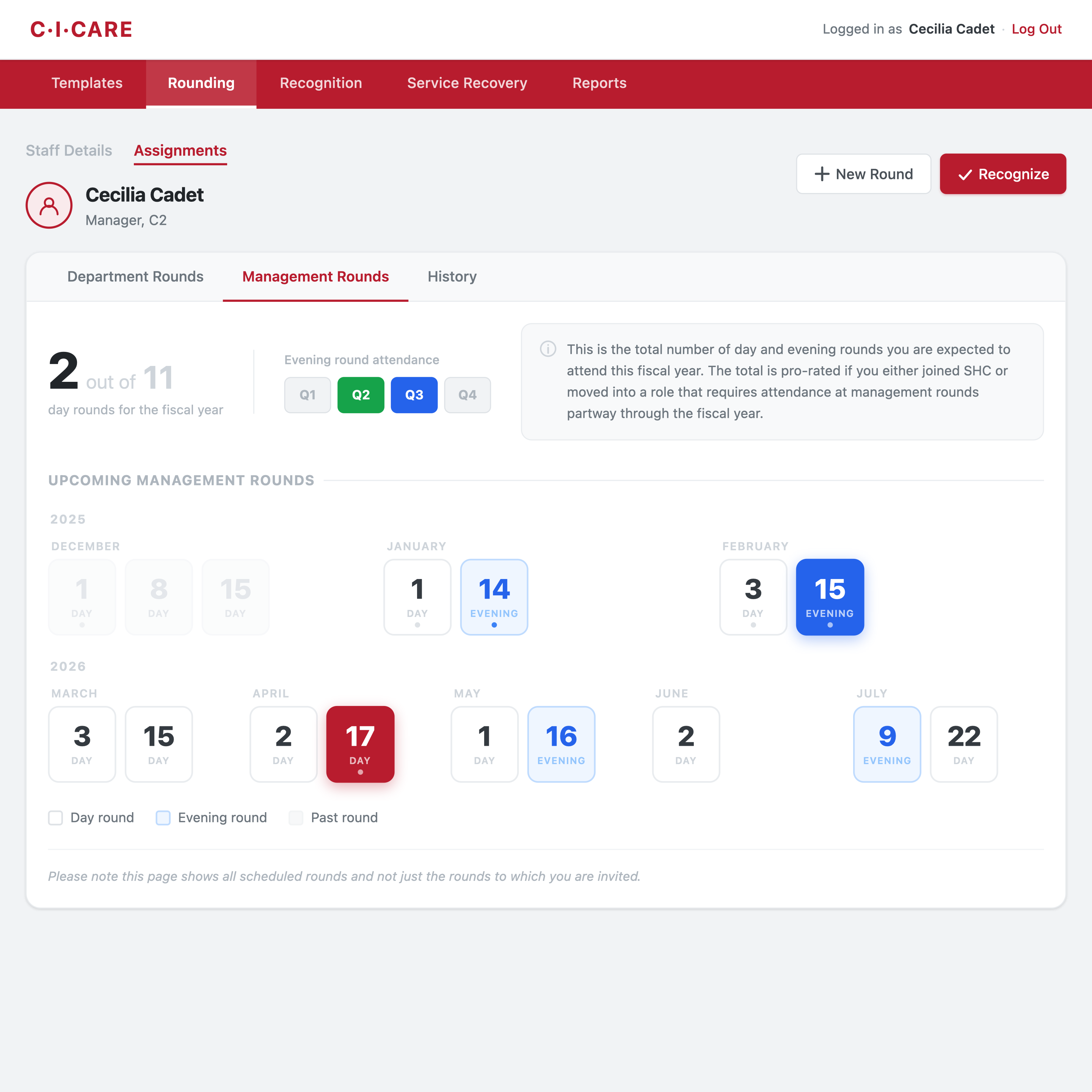 I framed the experience around speed, clarity, and accountability. Templates give teams a reusable starting point, the rounding calendar makes participation easy to understand at a glance, and structured observation screens turn soft skills into something teams can coach and improve together.