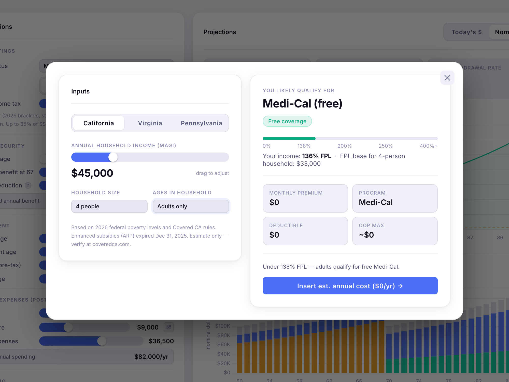 I built this financial planning tool as a vibe-coding exercise: a fast, self-directed prototype that combines product design, front-end development, and lightweight financial modeling in one interactive experience. The app lets users explore retirement scenarios through live controls for taxes, Social Security, spending, investment returns, healthcare, rent, and life expectancy, with instant visual feedback through charts and scenario calculators.