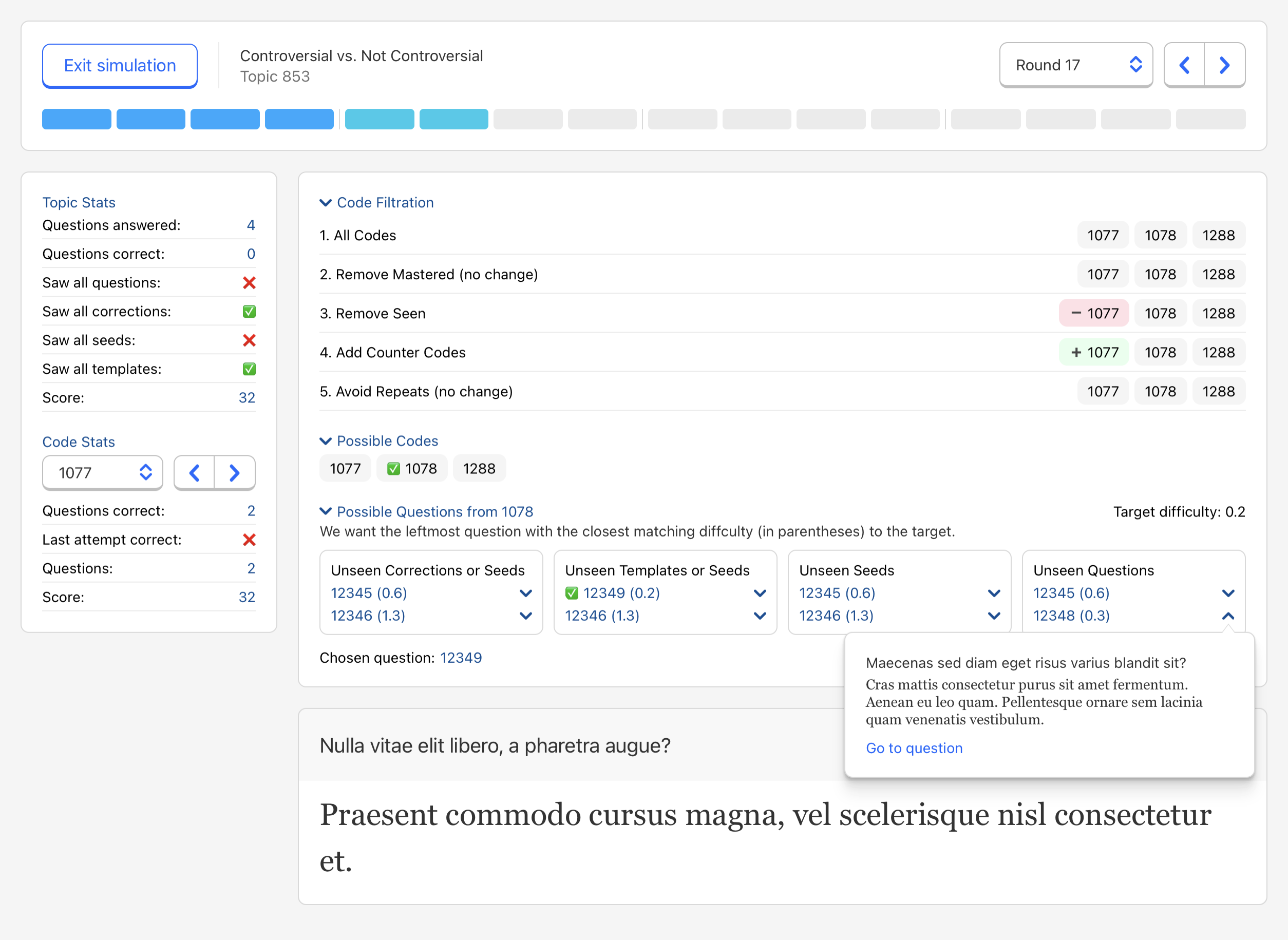 Other internal tools I worked on included a template builder for grammar questions, a collaborative editor for curricular content, and a tool for understanding question distribution.