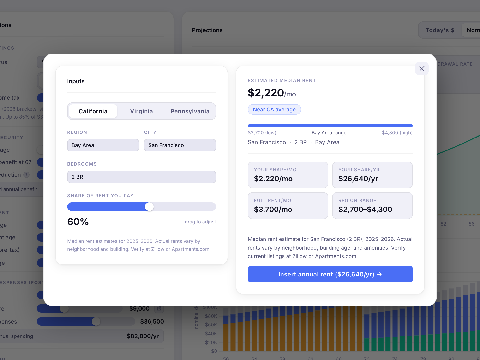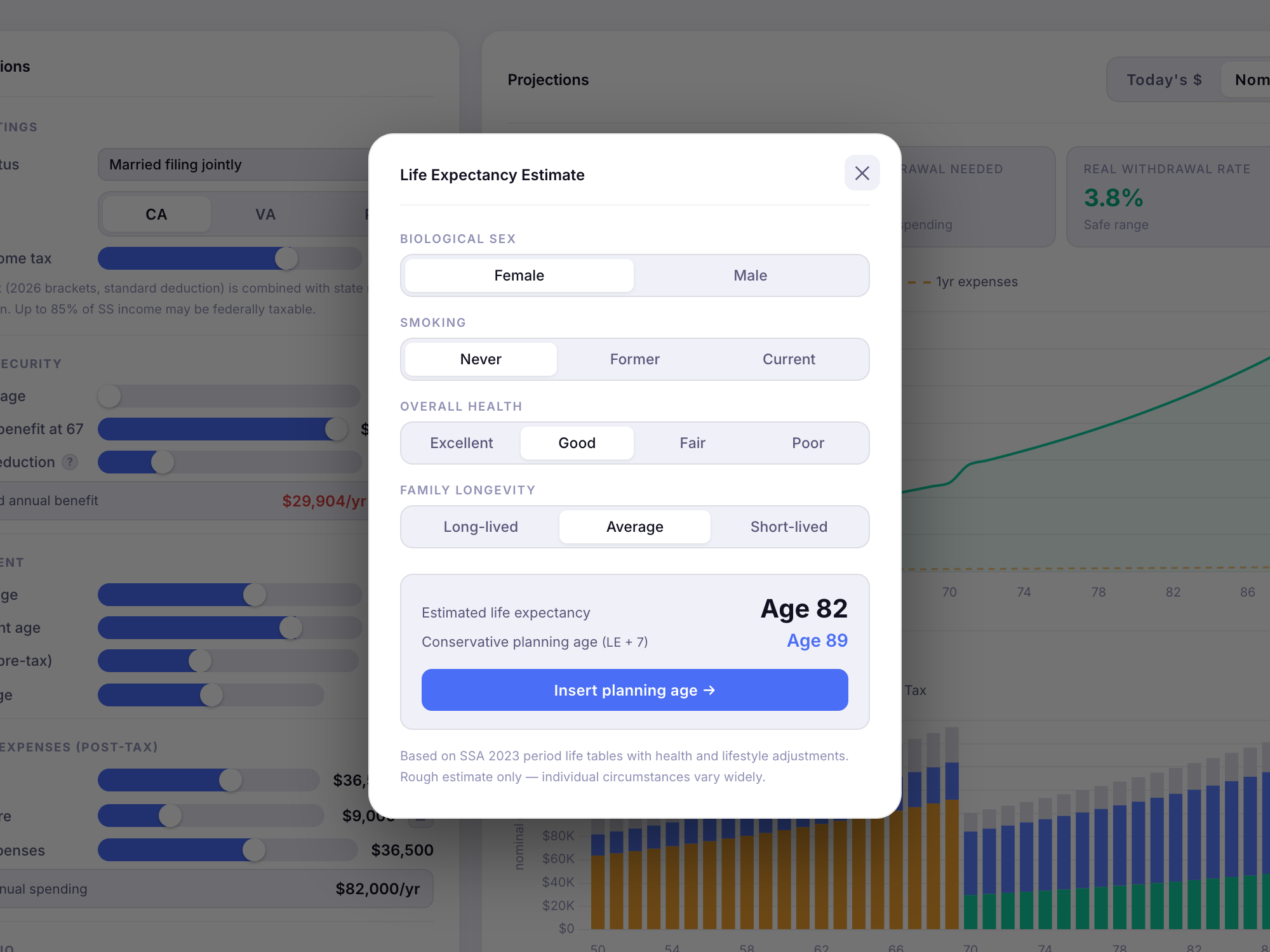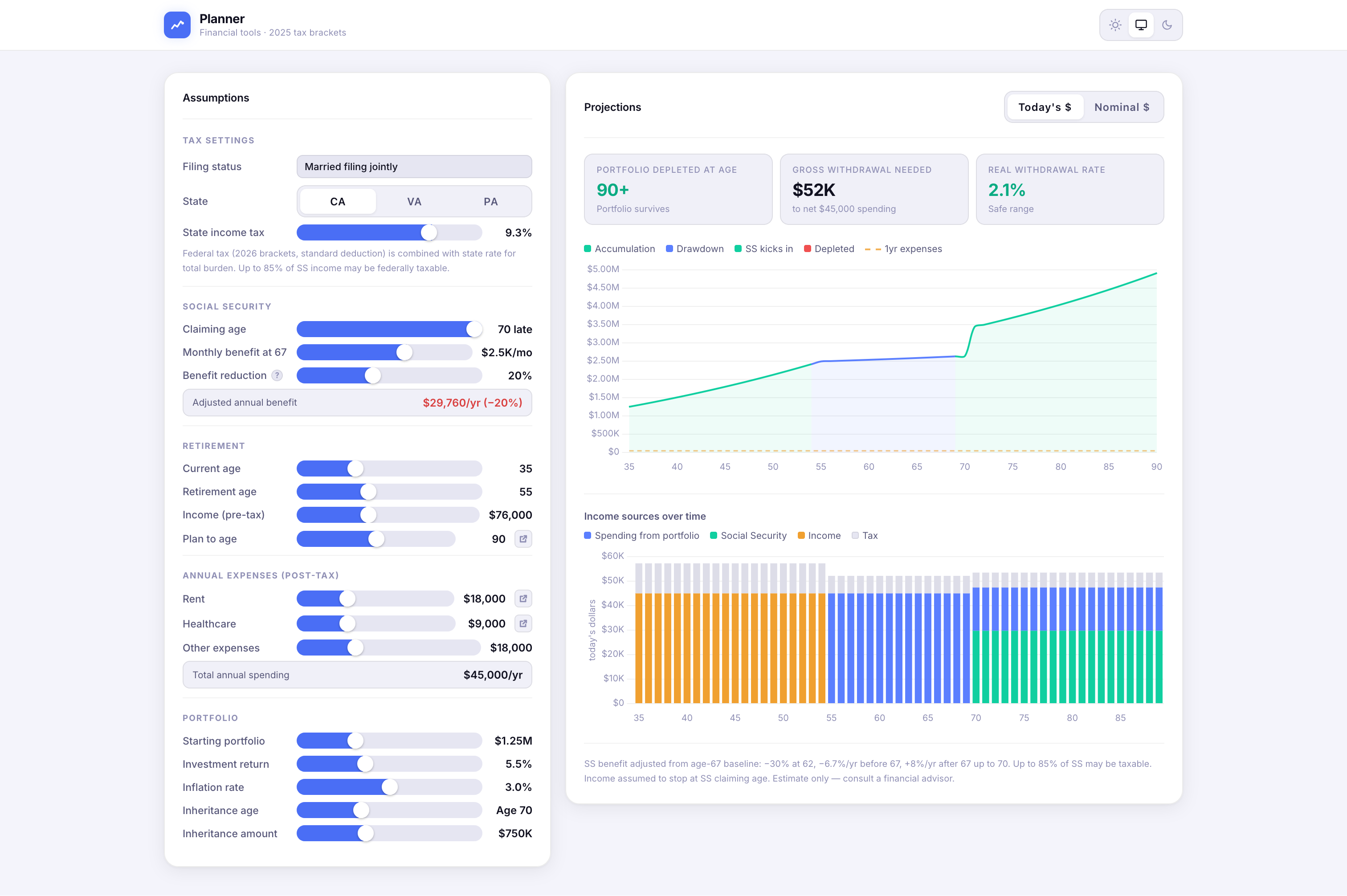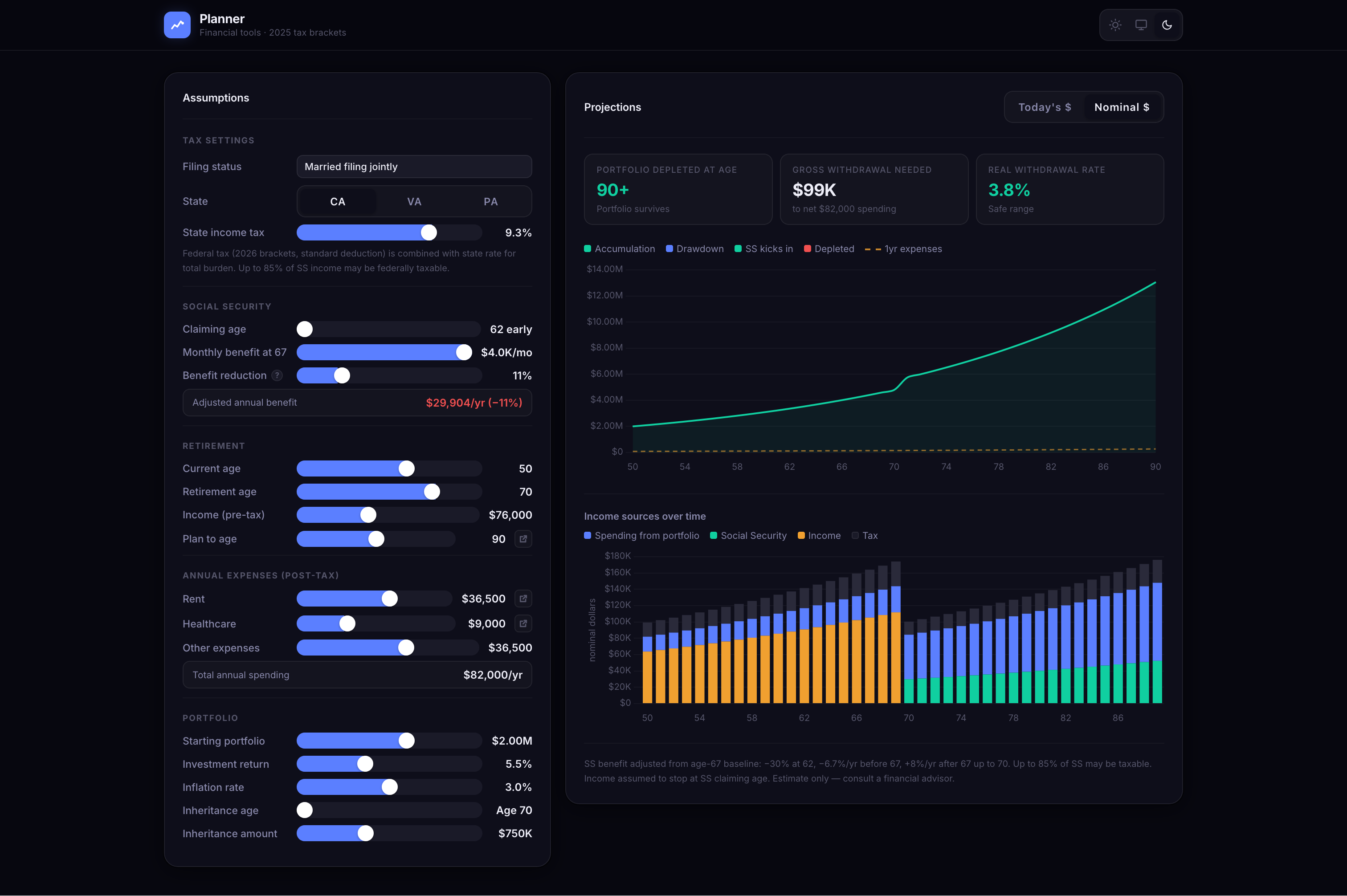 I built this financial planning tool as a vibe-coding exercise: a fast, self-directed prototype that combines product design, front-end development, and lightweight financial modeling in one interactive experience. The app lets users explore retirement scenarios through live controls for taxes, Social Security, spending, investment returns, healthcare, rent, and life expectancy, with instant visual feedback through charts and scenario calculators.